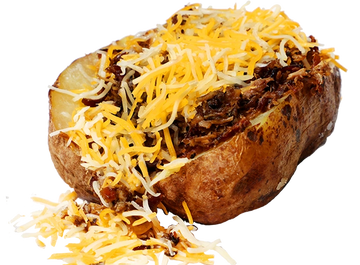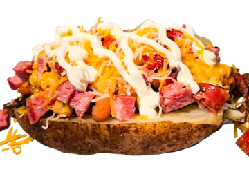 BAKED POTATO TOPPED WITH YOUR CHOICE OF CHOPPED BEEF OR PULED PORK, BUTTER AND CHEESE. ADD BEANS FOR $1.49
